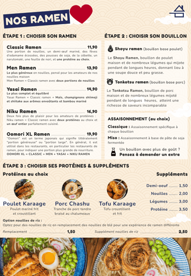 Nous proposons une variété de délicieuses options de ramen, allant des classiques aux créations originales. Nos nouilles, fraîches et faites maison sur place, sont préparées avec soin et expertise par nos chefs talentueux. Vous pourrez choisir parmi une sélection de bouillons savoureux, du shoyu au tonkotsu, pour satisfaire toutes vos envies.
